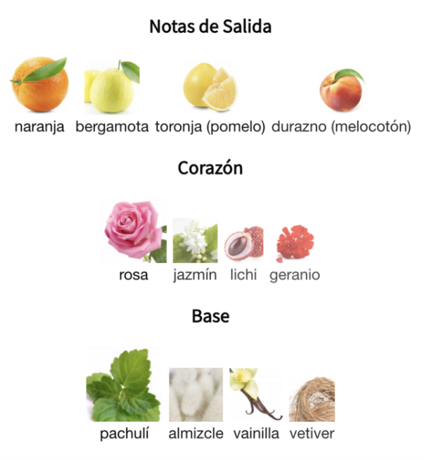 Después aparece el corazón floral: romántico, elegante y con ese toque delicado que nunca falla. Y cuando se asienta, deja una estela cálida y amaderada que lo vuelve duradero, envolvente y con mucha clase.