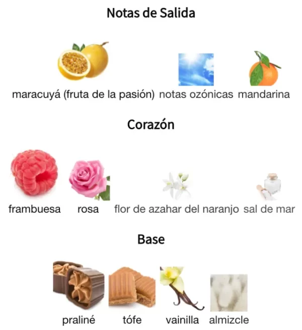 En el corazón, florece una mezcla sofisticada de rosa y flor de naranjo, realzada con un sutil toque salado-marino que aporta originalidad y profundidad. Y el final es irresistible: una base de praliné, toffee, vainilla y almizcle blanco que deja una estela cálida, dulce y ligeramente empolvada, perfecta para acompañarte durante horas.