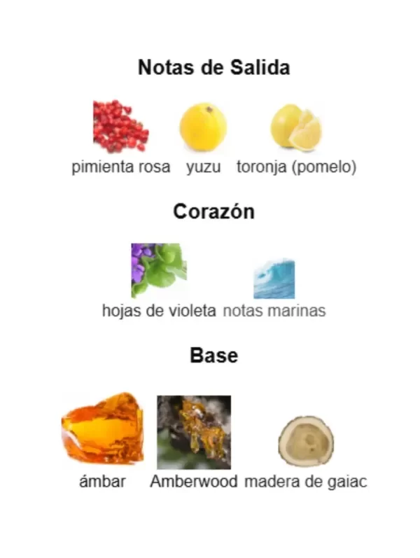 Abre con un estallido brillante de yuzu y pomelo, acompañados por pimienta rosa que aporta energía y un toque juvenil. En el corazón aparecen hojas de violeta y notas marinas que suman frescura elegante y moderna. El secado revela un fondo cálido de ámbar, amberwood y madera de gaiac que deja una estela masculina equilibrada.