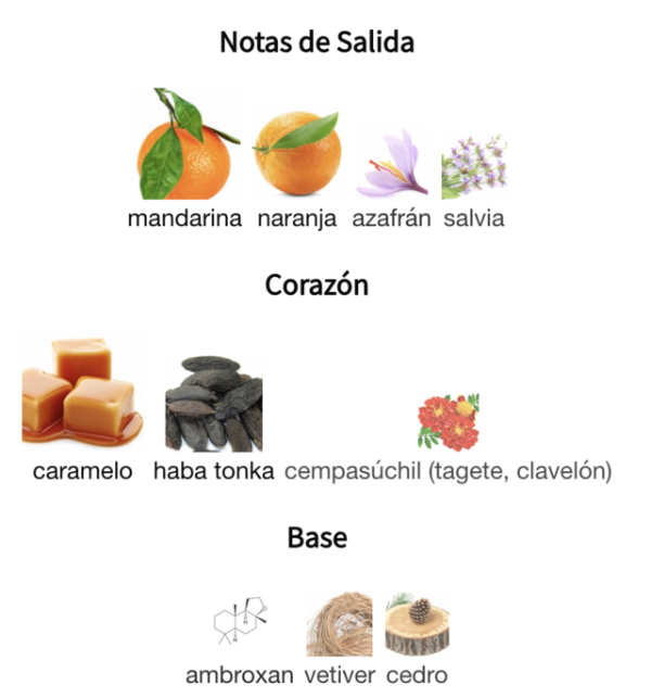 En el corazón, mezcla caramelo con haba tonka y cempasúchil (sí, esa flor intensa y vibrante), y ahí todo se vuelve más cálido, profundo y un poquito misterioso. Y cuando seca… aparece lo mejor: ambroxan, vetiver y cedro que le dan ese fondo amaderado limpio, moderno y duradero.