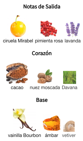 Desde la primera aplicación se percibe una apertura vibrante y refinada: ciruela Mirabel jugosa, pimienta rosa especiada y lavanda aromática que aportan frescura elegante. En el corazón aparece un carácter más oscuro y seductor, donde el cacao y la nuez moscada generan un contraste gourmand especiado, mientras la davana suma un matiz herbal distintivo. El secado es cálido y persistente, con vainilla Bourbon cremosa, ámbar envolvente y vetiver que aportan profundidad y estela duradera.