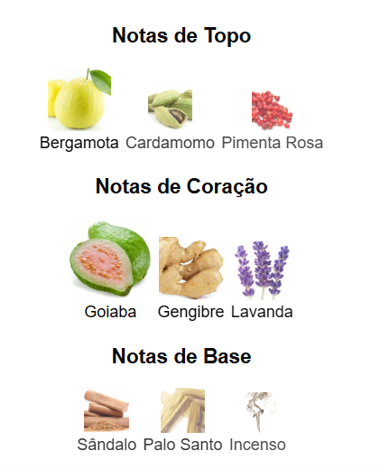 Su apertura combina el brillo cítrico de la bergamota con la fuerza especiada del cardamomo y la pimienta rosa, creando un inicio dinámico. En el corazón, la suavidad de la lavanda se funde con la exótica guayaba y el toque cálido del jengibre. El fondo es profundo y envolvente, gracias al sándalo, el palo santo y el incienso, que le dan una estela refinada y misteriosa.
