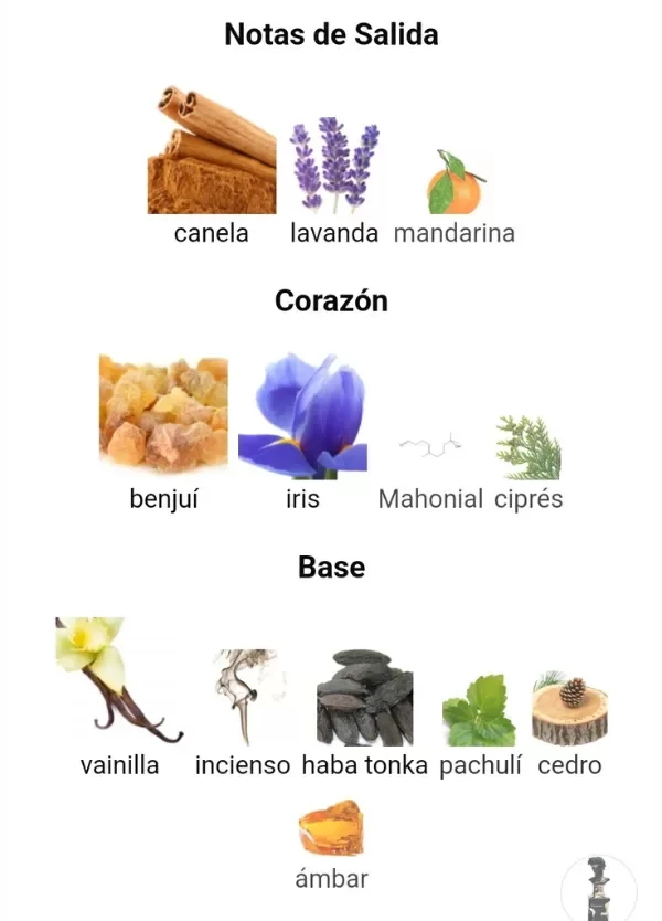 En el corazón, todo se vuelve más interesante: iris elegante, benjuí resinoso, ciprés verde y una nota floral moderna (Mahonial) que lo mantiene actual. Y cuando se asienta… aparece la magia: vainilla cremosa, haba tonka, ámbar, cedro, incienso y pachulí. Una base profunda y envolvente que deja estela por horas.