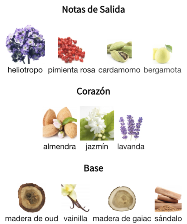 El corazón se vuelve más suave y elegante con una mezcla de almendra cremosa, jazmín y lavanda, que equilibra perfectamente lo floral con lo gourmand. Y en el fondo, el perfume se asienta con una base rica, cálida y duradera: oud, vainilla, madera de gaiac y sándalo, que dejan una estela envolvente y lujosa.